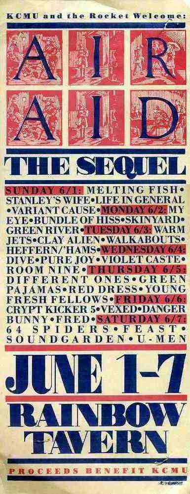 Jimmy Page Persuasions Pamona Boners Pure Joy Mason Proffit Ramones Red Dress Lee Ritenour Room Nine Rose & The Dirt Boys Sam & Dave Skinnyard The Skyboys Soundgarden Stanley's Wife Sun Ra Sweet Talkin' Jones Annie Rose and the Thrillers Tiny Tony and Rock n Roll Jones Big Joe Turner U Men Warm Jets Mary Wells Jesse Colin Young Variant Cause Vexed Violate Cast Young Fresh Fellows Walkabouts Warm Jets The Wild Chupatulis |