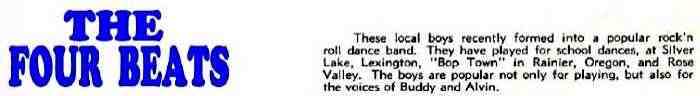 From 1957 (Summer) through 1960 Alvin Jones and the Four Beats played at Crystal Pool, east of Kelso, WA. They played Buddy Holly, Chuck Berry, Little Richard, Jerry Lee Lewis, Platters, etc., music of the time. In a place that could hold maybe 200 people inside, the crowds would run from 400 to 700 people every Friday and Saturday night. I can remember the night that the Kingsmen played at the Armory in Longview, WA, which is joined to Kelso, and they had 5 or 6 people show. They shut down, and came to Crystal Pool to see why everyone went there. We played "Louie Louie" for them. We were the only band to play at Crystal Pool and when we left in 1960, the dance hall was shut down. The time and place was so special to the era, that it will never be forgotten. Alvin Jones played locally in the Longview-Kelso area for many years, toured for a summer with Buddy Knox, sang in a country swing band with a fellow named Willie Nelson, who lived in Vancouver, WA for a time, and traveled on the road as Al Jones and the Rogues.Alvin Jones, September 2002