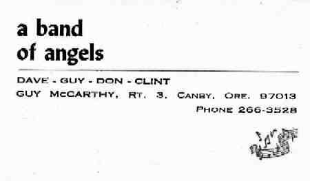 A Band of Angels was based out of Canby, Oregon around 1967 through 1969. They were really good, and played all the teen music places, armorys, high school sockhops, and battles of the bands.The band members were Guy McCarthy, Dave Giger, Clint Landeen and Don Barber. Don Barber passed away in '87.