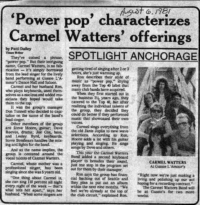 The Carmel Watters Band was based out of Seattle and spanned the years from the early eighties to about 1987. Band members came and went, but for about three years from 1984 to 1986 we had a relatively stable lineup that kept us playing from Bellingham to Missoula to Eugene, and all points in between.The Band was started by Ron and Carmel Watters and generally worked six nights a week for about fifty weeks out of the year. Carmel had a great bluesy voice, so even though we were playing mostly eighties cover tunes, there was a strong R&B undercurrent. She covered everything from Tina Turner to Van Halen, as we worked to introduce our own material.