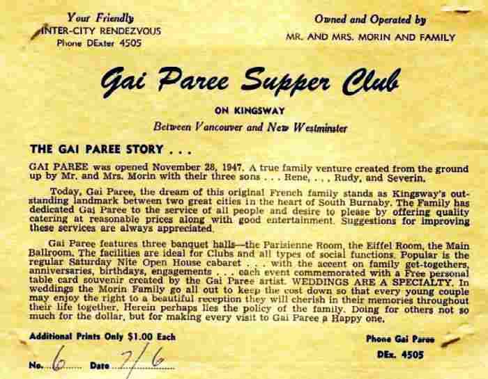 The Gai Paree in Burnaby went through few changes. I remember it being called Diego's for a long time, then was the Ozone, and then returning to Diego's. Finally it was changed to Maverics for the past decade. The building is slated for demolition in about two years.Nick Cardarelli, December 2005