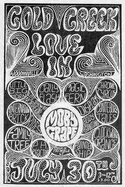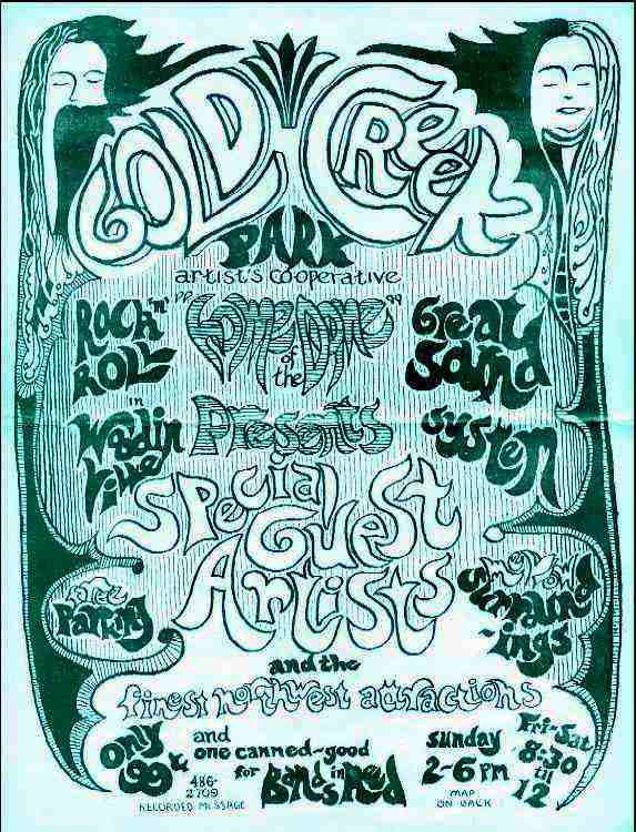 When Kidd Afrika rolled into Seattle in the summer of 1971, Gold Creek Park, (the “Dome”), in Woodinville, was notorious for its version of Woodstock, with the first major Rock Festival in the Northwest.Kidd Afrika became the house band, opening for many of the name acts that rolled through, including Elvin Bishop, Barry Melton, Harvey Mandel and Buckwheat, (remember them? . . . not many do). Gold Creek housed the band on the property, at one point putting us in the “Old Western Fort”. Part of our income included “canned food” brought by patrons of the shows, (see flyer). Tuna sandwiches for all!! When a big rain storm hit the area, it washed tons of trout into the man-made pond, so we would regularly catch our breakfast. One morning, Barry Melton comes to town and immediately makes his way to the fishing poles. They didn’t call him “The Fish” for nothin’.