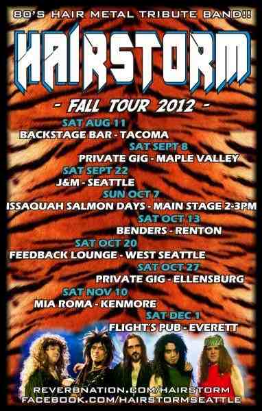 HAIRSTORM is an 80's hair metal tribute band that was formed in 2011 by veteran Seattle area musicians. They recreate the experience of the mid-80's hair rock scene with powerful and highly melodic performances, full with outfits and stage show. The sights and sounds of Van Halen, Motley Crue, Bon Jovi, Def Leppard, AC/DC, Twisted Sister, Whitesnake, Gun N' Roses, and more!!Some of the other Pacific Northwest music groups represented in members and crew of this group include: Omega, Bad Habit, Rearview, Upside Band, Jet City Players, and many other NW bands![]()