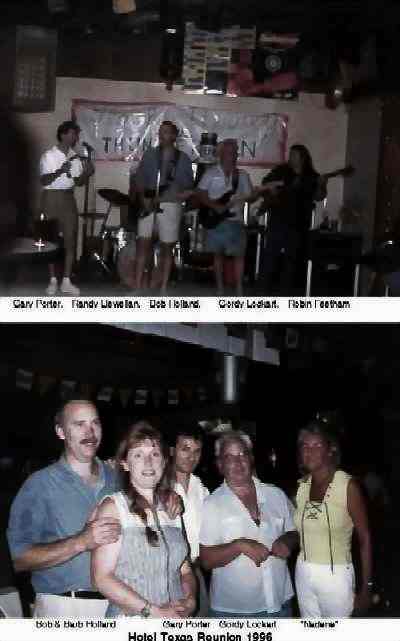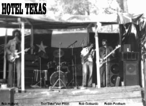 Hotel Texas was formed by Bob Holland and John Goss in Kirkland, WA and played a wide varied set of venues, mostly on the east side of Lake Washington during the 70's. The band was popular and has hosted several reunions. Some of the other Pacific Northwest music groups represented in members of this group include: The Gryffin Band, Jimmy Winkler and Translove Airlines, The Thundermen, Good Ole Boys, Sweet Talkin' Jones, Thunder Road (Kirkland).Robin Feetham, November 2002