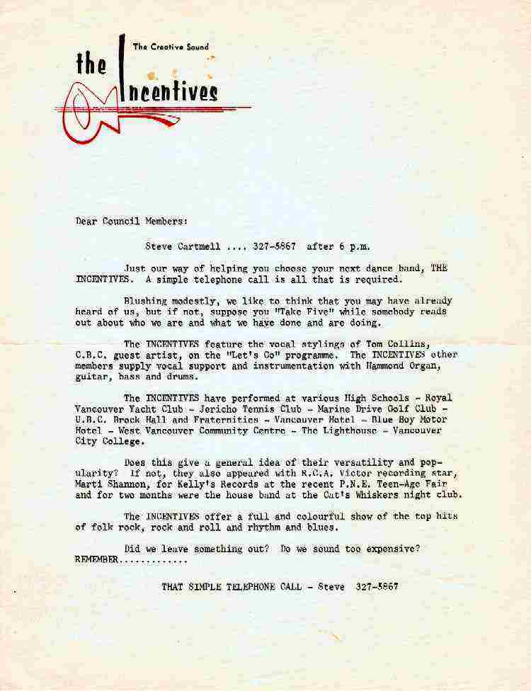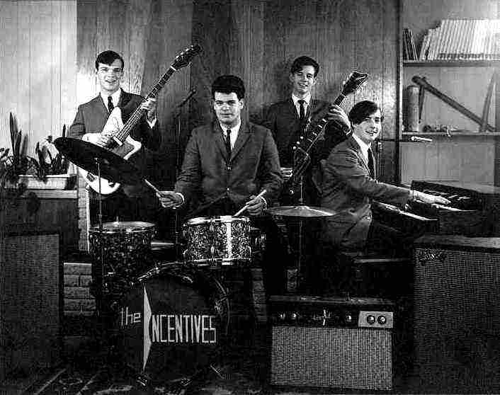 The Incentives band was formed late 1964 in drummer Bob Haywood's basement with John, Steve and Ed. Initially Ed sang lead until Tom Collins joined the band in spring of 1965. Barry Biddlecombe was their manager and Ian Austin did technical support for their staging and lighting. In late 65 John Purse left and was replaced on bass by John (Joe) Worst.They played extensively throughout the Vancouver area at private parties, fraternities, colleges, high schools and clubs, including a regular gig at Oil Can Harry's where they eventually disbanded in September of 1966. The group played mostly rhythm and blues covers of stax and motown, pop hits of the time and instrumentals of the northwest such as Dave Lewis.