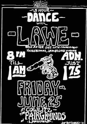 Loren Ziebell and Daniel Dunbar worked on bringing LAWE, a Salem, OR. based band, into the Longview/Kelso W A area on a regular basis. There they played fairgrounds, high school dances, colleges, teen centers, etc.. LAWE also did several shows for EID and other top promoters in the Northwest.