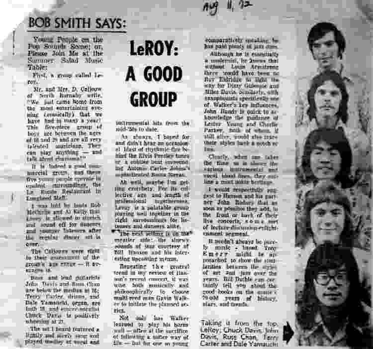 I am John Davis, the "bass player" for LEROY. We were a fairly popular Vancouver, BC band back in the 1970/73 circa. Our main focus in the beginning was playing the banquet and private party scene, but as popularity grew, we were contracted to be the house band at an upscale restaurant/dancing facility in Burnaby which lasted several months. In the middle of that contract, the frontman, Chuck Davis (my brother) found greener pastures down in California and my sister Nancy Davis stepped in to fill the void.John Davis, July 2008