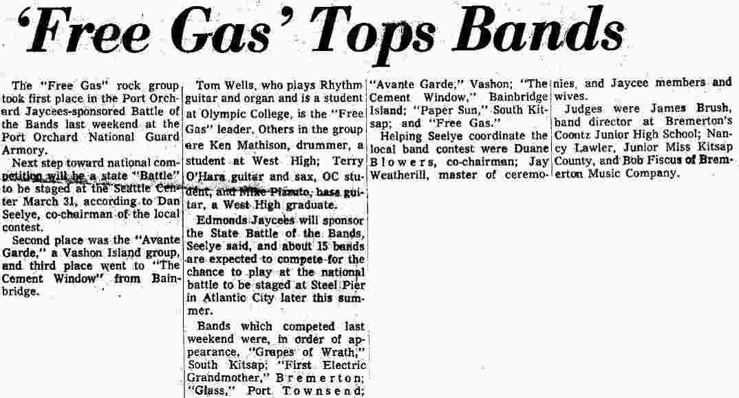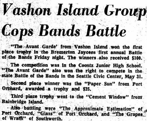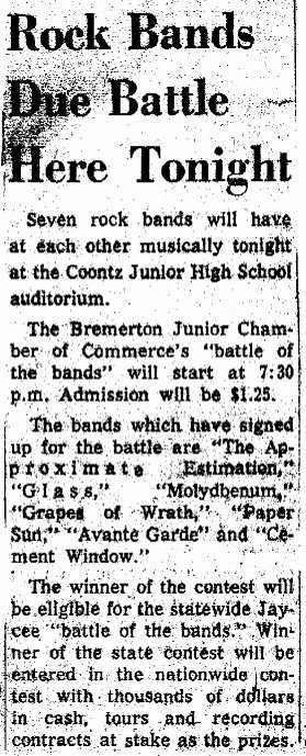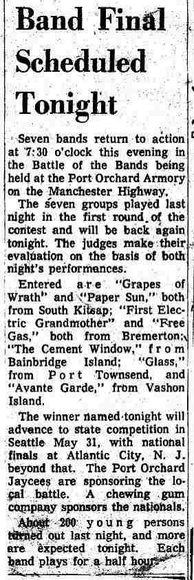 One of the times we played the Sherman and Clay Battle of the Bands, Glass, a Port Townsend band, played on the same show. I discovered The Soft Machine because of them. I was really impressed by Glass and thought they should have been one of the top three bands in the contest, but their music was far from the top hits of the day. We auditioned their keyboard player sometime after that contest, but the difference in musical style and distance apart, made it too hard to make it work.