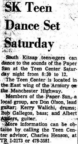The Paper Suns were a Port Orchard, Washington, band from 1967 to about 1970. They played various dances and venues around the Kitsap County area including Perl Maurer. They were the official band for the Port Orchard Fathoms-O-Fun Festival in 1968 and 1969, playing dances held at the Port Orchard National Guard Armory. They also played in the Sherman and Clay battle of the bands and won second place in one of the contests.After the band broke up, members continued to play in other bands around the area for a period of time. I still have some of the articles from the Bremerton Sun and Port Orchard Independent newspapers chronicling the band's dance events around the area. The band's name Paper Suns, came from the song “Paper Sun” by Traffic. The Port Orchard Independent misspelled the band's name in an article, calling them the “Paper Sons”, which actually gave it a cooler vibe for the times.