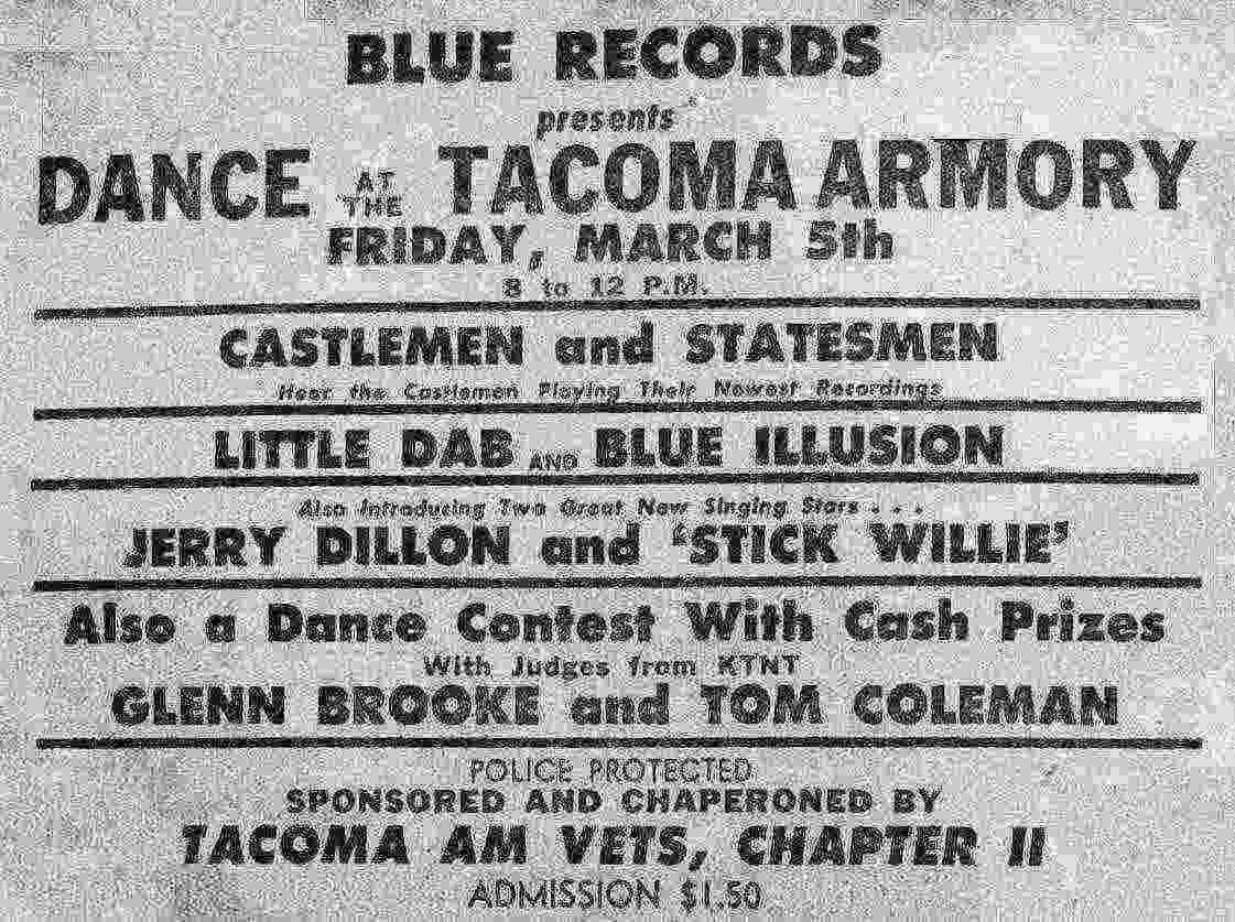 ![]() The Castlemen, Statesmen, Little Dab, Blue Illusion, Jerry Dillon, Stick Willie Tacoma Armory Courtesy of Bill Dean |