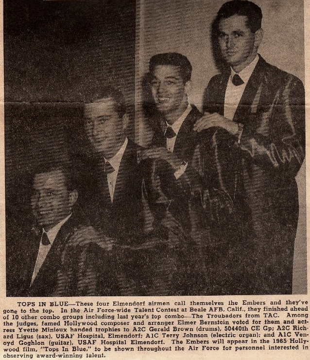 We were all from Elmendorf Air Force Base, Anchorage, Alaska. Together, we won the 1965 Air Force World-wide Talent Contest Instrumental category.The rest of the group consisted of Slim Coghlan, Bass guitar, Jerry Brown, drums, and myself, Rich Ligus, on Tenor sax. The song that we played for the contest was "Walk On The Wild Side" and were amazingly fortunate to have Elmer Bernstein as one of the judges.
