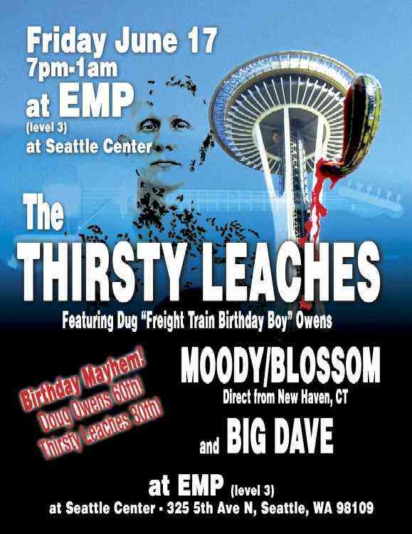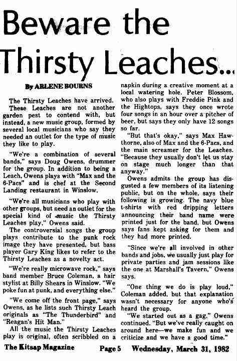 Thirsty Leaches started on Bainbridge Island and played mostly the West Sound plus Seattle gigs and frat parties. All original music was written by Blossom, Hawthorn and Owens