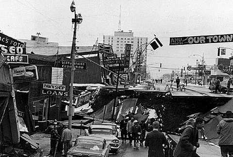 The below photo was taken after the earthquake on 4th Avenue looking back towards the broadcast building on 4th and Denali.