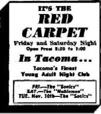 We played at most of the area high schools, the Evergreen Ballroom, Perl's in Bremerton, the Armory in Tacoma, and many times at the Red Carpet. We were often advertised on Seattle radio stations KJR and KOL, and we recorded for Jerry Dennon in Seattle with Kearney Barton as the engineer.