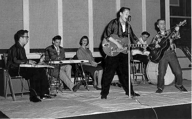 Rhythm Rockets and we started it in 1954. The members were Ray Wood, lead guitar; Chuck Wood, rhythm steel guitar; Norm McVeigh, fiddle; Mickie Wright, drums; Sue Anne Kitts, piano; and Donnie Swanland, steel guitar. The band disbanded in 1959 and reformed again in 1999 with Ray Wood, Chuck Wood, Heather Wood and Norm McVeighChuck Wood, March 2003